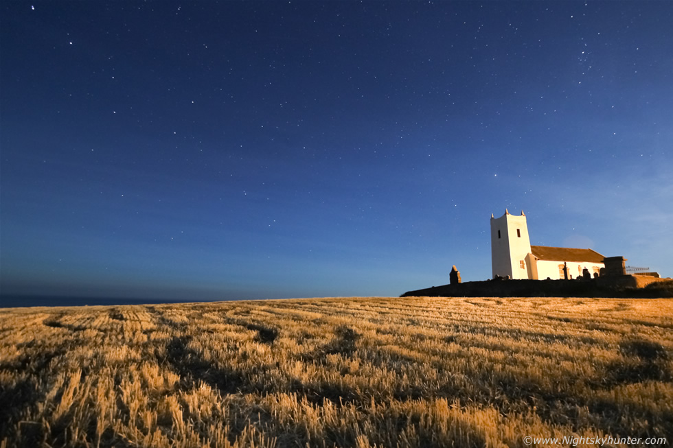 I arrived at Ballintoy then just as I stopped I got a text from John informing me that he was running late so I had some time to kill and decided to use it as productively as possible by doing photography before John arrived when we would be moving on to our target location for the night. I decided to shoot the old church, John himself had obtained stunning images from here not to long ago with round bales of hay in the field which made for some epic night shoots so I can't take credit for the location, I had taken night images from here before on and off over the years however I had never shot it from inside a freshly cut hay field, the bales were long gone however the field would be enough to add some interesting foreground to the scene. The gate was open so I walked inside and got set up as quickly as possible, I was excited by the view and wanted to waste no time at all so I could use this wonderful light. The moon rose behind the ancient headstones so I moved around to get a good angle while keeping the moon out of frame to the right. I liked this view with the Canon 24-70mm F/2.8 at 32mm with Auriga rising behind the church complimented by 'The Kids' and the bright and friendly star 'Capella'. I say friendly because the star sported a warm colour of gold-yellow which instantly equates to warm and friendly, Capella is often seen embedded within Summer time Noctilucent Cloud displays so in a way it reminds me of those warm muggy nights.
