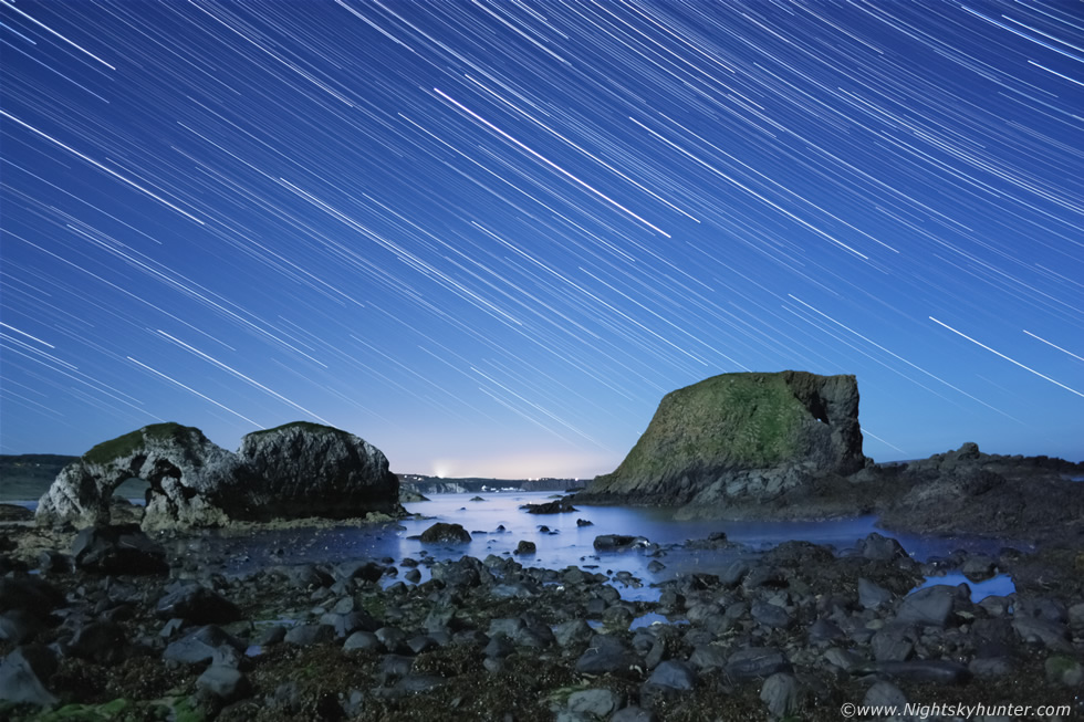 For the third week in a row I was going through my evening ritual of packing my camera gear and clothes into the van in anticipation of another north coast photo shoot with John Fagan. During the previous weeks we had been shooting time lapse and star trails at Dunluce Castle and Beaghmore stone circles and tonight we were once again going to meet up specifically to shoot both, only this time it would be Elephant Rock at the legendary Ballintoy. The forecast for September 30th was excellent with clear skies all night long in slack winds with a narrow dark window for one hour or so before moonrise so the plan was to get on location early and take advantage of that dark window then use the light from the rising moon to illuminate the landscape which would greatly enhance our photographs, we would meet at Ballintoy at 21.30 UT. As of late it has felt like my life has revolved around driving lonely dark roads at night and charging batteries, the latter in particular I could do with my eyes shut, charging my Canon 600D batteries, 450D battery, head torch battery and Go Pro battery, this is a ritual for me, I always charge these devices late at night when I return from a photo shoot then once again top them up the following day, this is more of an OCD thing with me because the routine gives me peace of mind in the knowledge that I will never leave on a shoot with drained batteries, and thankfully that never has happened to date, my check was complete, my dinner ate then a quick check outside showed the sun setting in the west behind the dark slope of the Sperrins, I noticed it was setting further S now, a sure sign that the seasons have changed and that Winter cannot be far away.