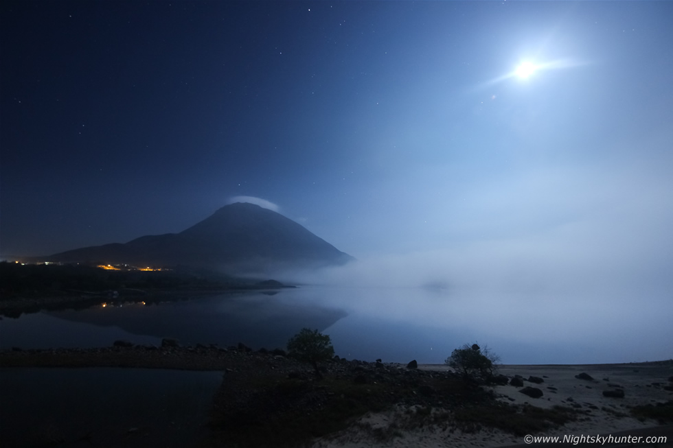 My favourite scene with the peak of Errigal sticking up above the moonlit fog, what a way to end this photo shoot. Make sure to check out the time lapse of this scene on the video below. We spotted a low lunar fog bow behind us in the valley then we decided to call it a night, we had done well and had acquired a rich bounty of images which would keep us busy for sometime so we were more than happy with the way the night turned out, this was my second time shooting in Donegal and I have to admit that I love the place, there's nothing better than shooting from a fresh location and beginning a new adventure. The drive home was deadly due to dense fog, Paul had his work cut out for him all the way from Donegal to Omagh and I didn't relish my own drive home after this, I knew it was going to be just as bad if not worse on the Omagh road. My own drive from Omagh to Maghera was an experience to say the least, I would rate it among my top five most dangerous drives because the fog was so dense and unrelenting, it never eased once for the entire drive home, the lights never seemed to penetrate through and for much of the time I couldn't see the edges of the road or the white lines, it was stressful driving through this at 04.00 in the morning when you are tired with the constant danger of driving into someone, it took every ounce of concentration to stay on the road and stay alert the entire time and when I finally arrived home at 05.00 I was mentally exhausted, what a drive that was, finally I was able to get my head on the pillow and drift off into a well earned sleep.