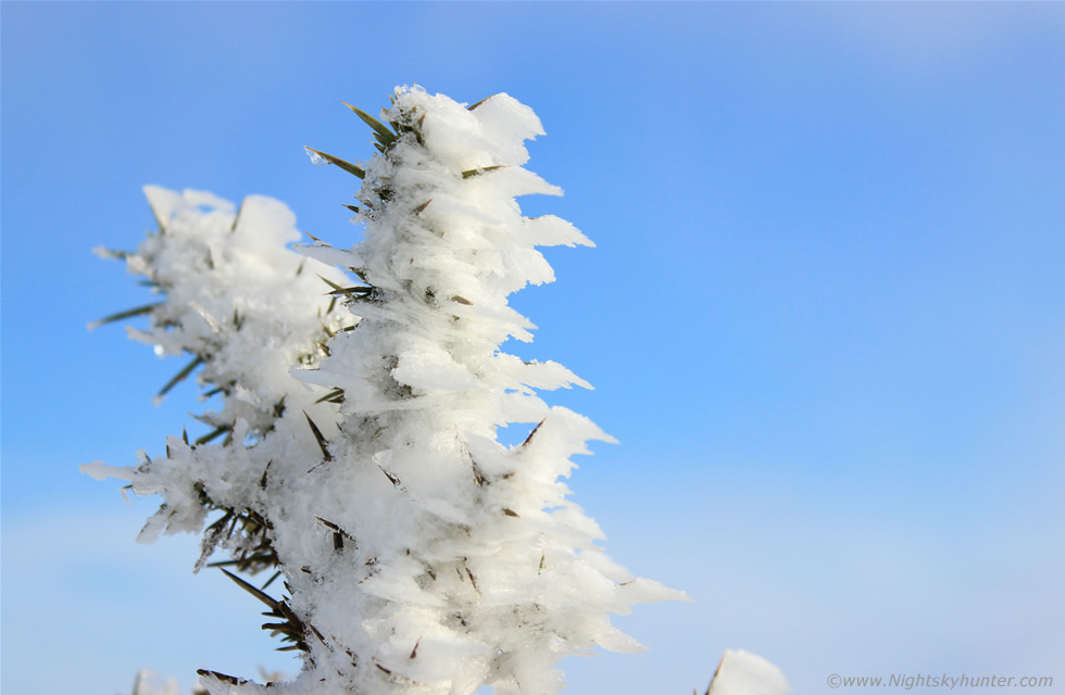 The summit must indeed have been exposed to severe conditions because we found widespread rime ice formations everywhere we looked. The rime covered portions of the wire fence in conjunction with dozens of frozen water droplets and it even coated every blade of grass which punctuated through the snow layer, then Roisin spotted this bush of shrubs which was covered in a very grand formation of rime which had formed in supercooled conditions then sculpted by the raging winds. Hoar frost is made from ice crystals, rime tends to be white and more solid, here it is swept to the S downwind during the recently Nly gales and squalls which had affect this part of the country. This was the first time I had seen it this Winter which made for quite a treat, I had to lay down flat on my stomach in the snow to get this image of the rime against the blue sky.