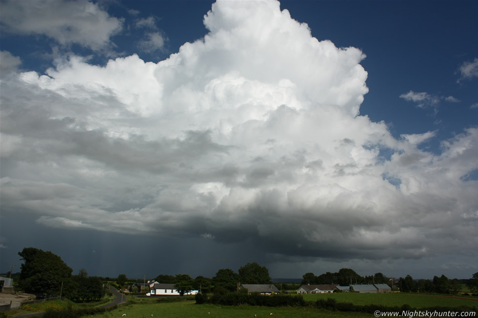 I left Maghera and headed S to meet the cells that where heading my way and with a slack flow at lower levels I knew any storms which did form would be slow moving and hence much easier to chase, in fact, my favourite chasing conditions are these slack Sly flows associated with the post frontal environment behind Summer low pressure systems and their associated frontal systems. Slow moving storms can be a problem for those who don't like bad weather or have to work outdoors as heavy rainfall tends to stay in a particular area for a longer period of time which often leads to flooding and dangerous driving conditions however to a photographer slack is like heaven as these slow movers allow you to stay within visual range and watch as any cell develops revealing its full life cycle and drastically increasing the odds of transiting into a very photogenic stage. As I drove along the Glenshane Road convection looked so good that I simply didn't want to waste anymore time so I pulled off the main road onto the E side and drove along the narrow hard shoulder over crunching dirt and gravel until I found a spot which offered a good view away from clusters of trees. The above image shows the rapid birth of a big storm with its towering updraught starting to anvil out along the troposphere as its cauliflower tops boiled in the hot afternoon sun. This was facing S and the cell was slowly moving towards me so I had the joy of watching it evolve in full view, I had a feeling it was going to do something good because it was still over 10 miles away and there was nothing to stop it growing in this very unstable air.