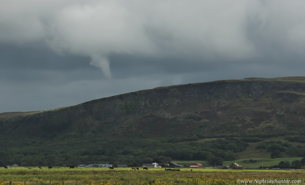 Then when I switched on my camera I realized with horror that all my settings were still for night shooting, I had to reset everything, all this messing about cost me valuable min's and the funnel was still spinning in the sky, from the time I had first spotted it on the road it must have been five min's already, it likely wouldn't last for much longer, I got my act together and crossed the road, leaned on a fence, and began shooting stills, this wide image captures the entire scene, I was facing E looking towards Binevenagh, the white clouds mark the rear (flanking area) of the cell which was moving away from me on the NWly flow which was taking up a fairly large area of sky, the dark cloud and rain to the upper left was not associated with the cell.