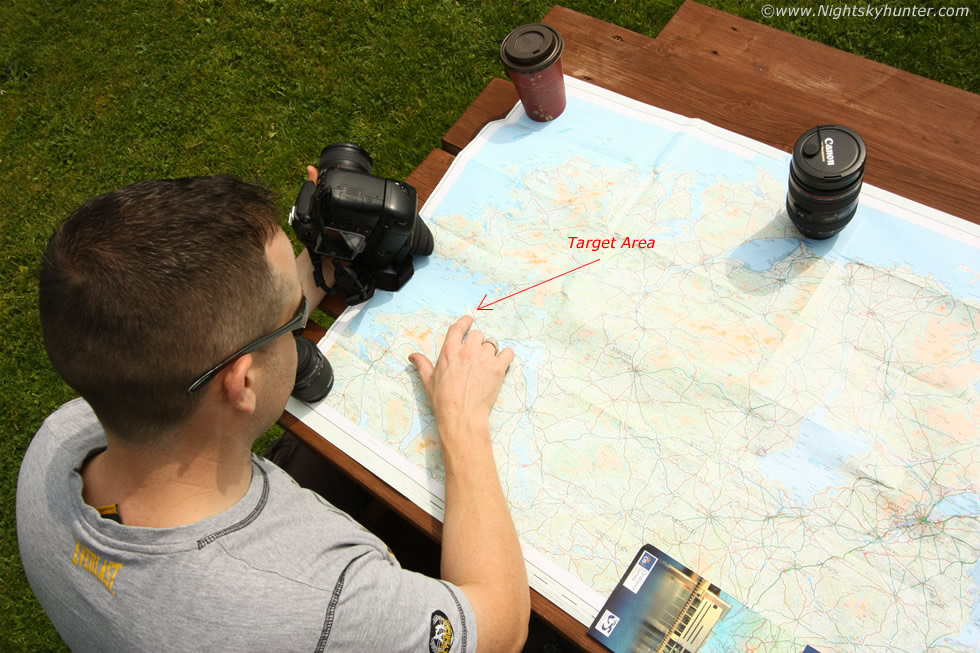 We drove to Belleek and decided to stop for some lunch so Paul and I grabbed our supplies and sat on the picnic tables among the grounds of Belleek Pottery where we enjoyed our sandwiches and coffee, I was on the lattes again and needed that extra kick of caffeine for I suspected it was going to be a long day. It was a wonderful experience eating our lunch here along the lush green hills adjacent to the River Erne under intense sunshine and blue skies, there wasn't a drop of precip in the country anywhere at this time however that didn't worry us because we had faith in the forecast and we were not expecting things to kick off until 17.00 or more so we had time to kill, I have to say it felt like being on holiday sitting here and thinking of it now really puts a smile on my face. Here's an image of us planning our attack on any developing storms, we where very far from home and currently located near the Lough on the map beside Paul's ringed knuckle, our target area is indicated by the red arrow. We had decided that W coastal locations would be a good bet because of the excellent vantage point and also the last outlook had mentioned a risk of waterspouts so we couldn't pass up that opportunity.