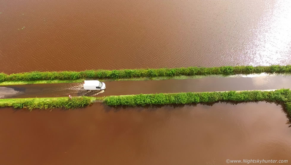 Drone Flight 526, August 23rd 2017, aftermath of historic thunderstorm and severe flooding event. This time drone footage of the fields near the Moyola River which had burst it's banks and van driving on flooded road. The white car was someone I know, permission was given to film them so I could get closer to the action.