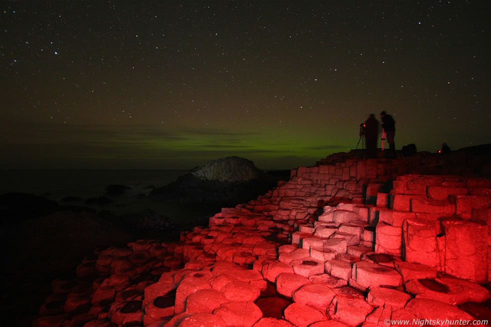 We decided to change location as another outburst was possible anytime so we checked out the Giant's Causeway where we encountered several other photographers shooting the aurora, I knew one of them and made a friend with the other I didn't know and we all shared our story of what we saw. There once was a time you could visit any coastal location at night when there was an aurora and you would be on your own however now it's a different story, there are photographers everywhere at all the famous locations getting their own aurora images which is truly fantastic to see, it was obvious to us that N. Ireland is without question an aurora hot spot and on the world stage of places to see the northern lights. We did a little shooting however we felt we where all getting in each other's way (five of us) so Paul and I tried another part of the Causeway and witnessed another brief outburst with beams slowly waxing and waning in brightness as they crept between breaks in the clouds near the horizon then they were gone again, the above image shows three photographers enjoying the aurora, I simply lit up the famous hexagonal-shaped rocks with my red head torch.