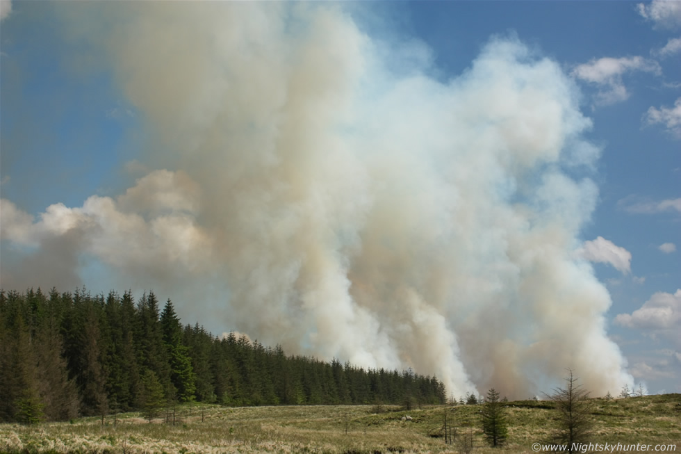 After a long cold Spring we have just had a fantastic heat wave here in N. Ireland spanning almost two weeks with temps between 20 and 25 degrees C complimented by clear skies every day and night which has been amazing for this country. June 5th was another hot Summer's day and I was already on the road by late morning heading S through Cookstown into the open country roads. There was a slight risk of thunderstorms so I was hunting storms, I was fully aware of the warm air above creating a strong cap in this high pressure environment however with some latent instability, strong solar heating, and a slack wind field I knew there was a chance of funnel clouds from any weak convection which formed and that was my intention this day. My plan was to drive S to Omagh then park and watch convection develop then shoot W during the peak afternoon period where CAPE values were highest however that plan went straight out the window when I glanced to my right and saw distant white smoke rising from a fire which had suddenly came into view, it was many miles away over the hills where I had never been before so I decided to abandon the storm chase and pursue this fire instead for I suspected this would provide me with the most dramatic images of the day. With me was my now retired Mum and my old faithful pal Rua - our Cocker Spaniel pup who loves getting out in the car, she had been with me on recent chases where I have caught four funnel clouds and now she would be seeing her first wild fire.