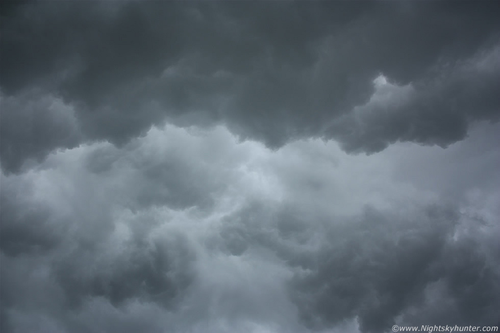 This storm was huge, check out the size of that gust front as it came racing across the Glenshane Road at high speed, this is 18mm again, yet I can only capture the N (R) side of the structure, the rest extended far out of frame to the LHS and would require at least three 18mm frames to show the entire guster in all its glory. Visually I could see a notable green tinge within the intense precip curtain, that's the second storm this day to show that unique colour. This strong multicell storm had been moving across the country for many tens of miles and had been producing alot of c-g lightning, I couldn't see the individual bolts since they were embedded within the precip however I did see periodic pink flashes and hear distant rumbles of thunder which gave the impression of a threatening animal with huge chest cavity moving in for the kill. I love watching these big outflow features on storms, they always look very impressive and promise a nasty time when they hit. Since gust fronts/shelf clouds are outflow features you can be guaranteed there will be heavy rain or hail and strong wind gusts which are often accompanied by thunder and lightning, they mean business and are a good visual indicator of imminent trouble.