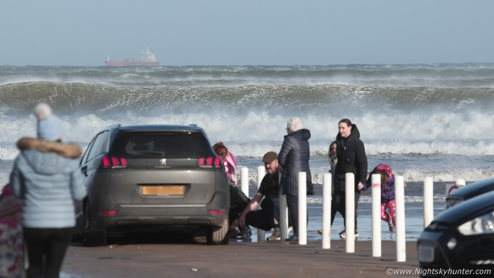 We were swallowed by the storm and bombarded by strong gusts and hail stones. Suddenly out of nowhere a storm surge - the biggest of the day - made its way up the beach at alarming speed catching many cars off guard. I seen it coming but knew it was too late to move, I just switched on the Go Pro and made sure Roisin was also filming with her phone, she was getting quite worried. Everyone panicked, cars reversed or turned as fast as they could to escape the ocean coming in, a family with children were caught off guard on the right. I could have reversed but I decided not too, there was too much going on, in such a mad rush it would have been all too easy to accidentally reverse into a person or child, or even hit another car in the chaos, I said to Roisin just sit tight, let it overtake us, which it did, then wait for it to retreat again, that was the only plan. Roisin had never experienced this before and was rather shocked and excitable and even scared, however I had been in far worse storm surges than this before and knew we were fine, it looks dramatic but the water was rather shallow, but it made for good footage, the above is a frame grab from the window mounted Go Pro.
