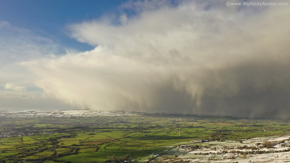 Within a few minutes it was rite on us moving very fast and making a bee line for Benbradagh, even at this range the cell's invisible gust front was already blowing hard and enhancing the background wind. I was loving the structure on the leading edge and that line of falling snow, it looked menacing. The gusts were getting stronger then I realized I was on my last battery and had 30% power remaining, I was only 300m away and 80m high however I knew that the cold temperature and the fight with the wind would eat into the battery life fast, I held on as long as I could.