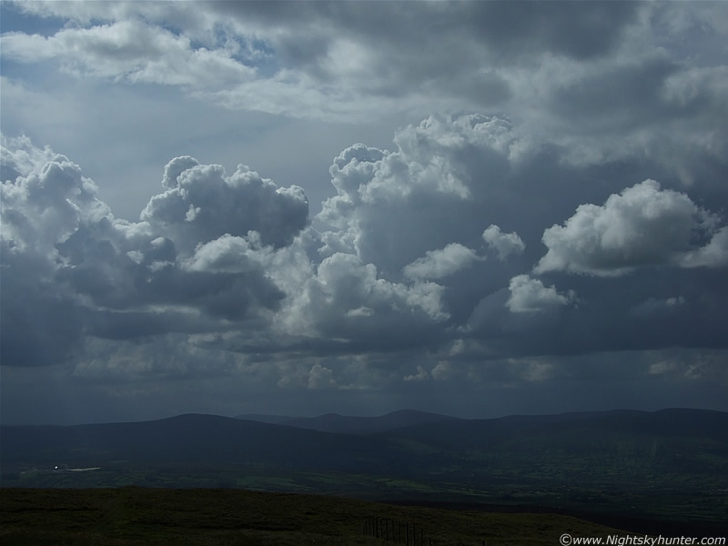 We hiked around the mountain for a while and climbed to its very top which is marked by a tall pile of rocks. It brought back memories of watching good storms from here in 2007 with Conor McDonald. Visible miles away to the NW was thunderstorm number two. I'm not certain exactly where it was located but it seemed not too far away from Maghera again. This is a zoomed shot looking at the very back of the cell as it moved into the distance. Heavy curtains of precip broke out and within that area could be seen blue c-g lightning followed by distance rumbles of thunder. It was a surreal scene to be sitting under hot sunshine with Buzzards calling, Butterflies fluttering around you, while thunder boomed at the same time. On the image you can just see a section of the anvil, the rest of it extends up behind that mid level cloud and high up into the atmosphere out of the frame. Note the dark lowering under the cell to the ROH behind the rain. It was too far away to notice rotation but I suspect that actually could be another funnel.