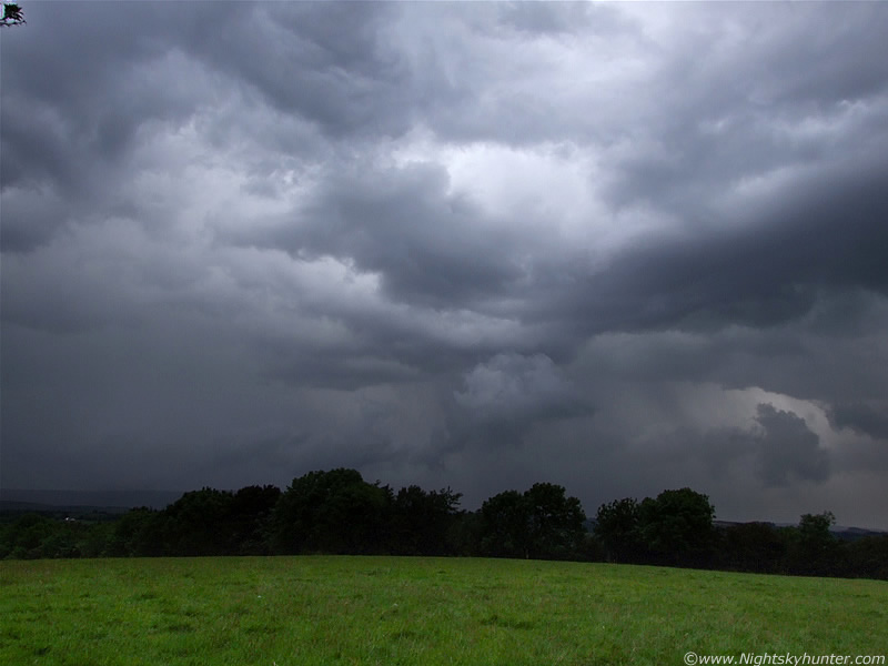 On the road between Moneymore and Tobermore was when we saw thunderstorm number three of the day, and this one had nasty wrote all over it. This was snapped through the front windscreen again, the image doesn't do the sight justice I can tell you, the entire W to SW sky was pure black, an absolute evil sight. It approached over Slieve Gallion where we had been based not too long ago and was moving to the NE. It was just a huge dark mass of cloud with torrential rain from it, and it was heading for Maghera, my home. On the drive home I watched it approach over the Sperrin Mountains, at this stage I seen no lightning but I was certain there would be very soon. We got to Maghera just ahead of it and I went back out again, this time on foot, to watch it come in.