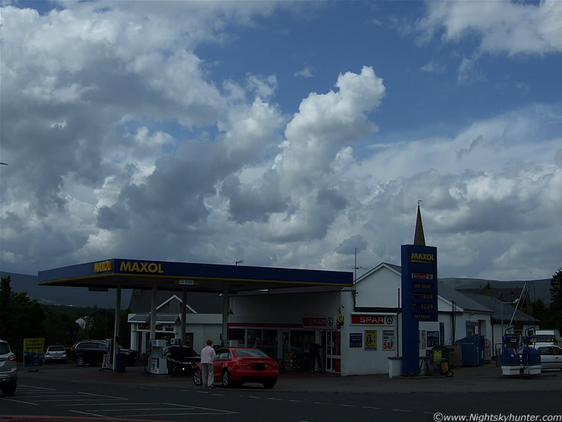 Since this was going to be a long day we stopped in Draperstown to get some snacks. The girl working at the till on the local shop commented on what a great hit day it was, when we told her there was thunder and lightning at Maghera she seemed genuinely shocked. Back out in the street I hung around the car for a while studying the sky. I knew by looking at the clouds that a storm would arrive over here, or at least near here, at some stage in the day, the local mountains which surround the place would enhance any storms for sure. It always amazes me how little people know about the sky, and the few which did thought it was a fine Summer's day. Not one of them knew by looking at the convective clouds that there could be a trouble ahead. This shot was taken while leaning on the hot roof of the car showing evidence of wind shear in the atmosphere above the town. This would later come in handy for storm organization and longevity. The view behind me was semi-obstructed by buildings, tall trees, and a Church, however within the gaps I could see stunning updraughts exploding up with a good quality base. I knew by looking at these that the chance of getting a funnel cloud today was very high indeed.