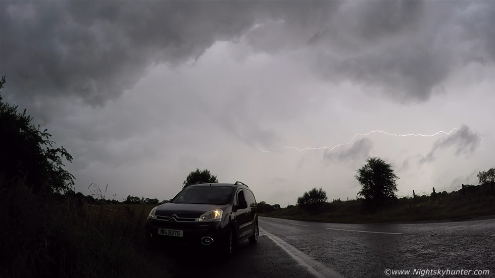 I turned the Go Pro around and began taking video facing S towards the advancing wall of precip, there was lightning going on in there somewhere which I hadn't seen yet so I hoped the Go Pro would catch it. Much to my delight it did, this in-cloud (i-c) bolt lit up the precip from within as it whipped across a large area of sky (this is extreme wide angle) and above my van, this was a nice personal catch. We drove N again through Omagh then onto the Cookstown-Omagh road where we played a game of catch and mouse (the storm was the cat) trying to stay ahead of it once more, I lost count of the many back roads we took, one of them was so small the van could barely fit on it, not to mention the fact that the tarmac had been ripped up into pieces with large ragged pot holes with the road covered in large stones, it was quite a nightmare and sore on the tires, from this crazy road there was an open gate into a field so I walked in there and watched the dark clouds approach however by 19.30 it was clear the storm was on a downward trend, it was moving N into stable air and cooling temps so was in the process of winding down so we left it in peace and drove home and made it back for 20.30 which made for 8 1/2 hours on location this day.
