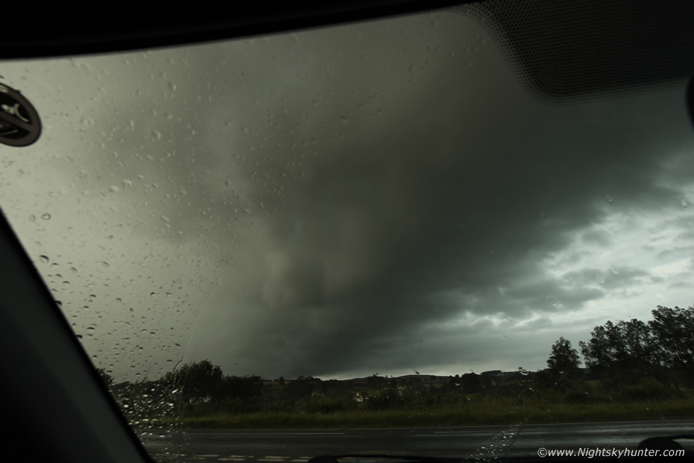 We drove frantically through heavy rainfall then punched through the core into dry air with better visibility, we pulled over in a layby on the Cookstown-Omagh road for another look. I ran across to this side of the road to get the gust front over the main road, I was using my trusty Samyang 10mm wide angle. It wasn't long before we noticed rotation rite over the road, that dark lowering was rotating in a very obvious fashion, Paul seen it too but just when things were getting interesting the rain arrived again and we lost view. Suddenly a jeep towing a boat drove past us, the driver beeped his horn, it was Captain Birdseye passing by. We where soaked in our t-shirts and ran back to the shelter of the jeep once more.