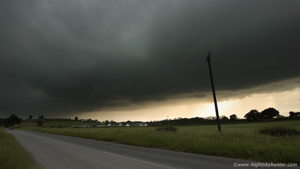 We pulled over at a road side S of Cookstown, Paul reversed into a grass bank, the 4x4 came in handy. This was the view to the S, huge storm approaching, convective line with textured base all back-lit by the lowering sun. If this couldn't get any better we heard several angry rumbles of thunder, I set up the tripod and shot a short time lapse. Standing within the long grass with the farm in the foreground and this storm approaching felt like another part of the world, more like Kansas than Tyrone.