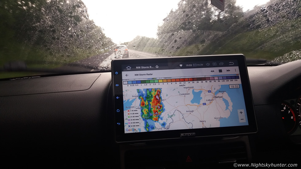 Radar at this time was madness, a huge squall line was moving SW to NE across much of N. ireland, even extending well below the border and was producing lightning. We continued to chase it E along the Cookstown-Omagh road closer to Cookstown, we encountered the worst rainfall we had seen all year, it was almost blinding to drive through, the road was saturated and rain drops battered the windscreen, we could barely hear ourselves talk, we continued driving through the core and began to make some head way, we had now extended the chase, there was no turning back, at this moment in time this was the convective event of the summer.