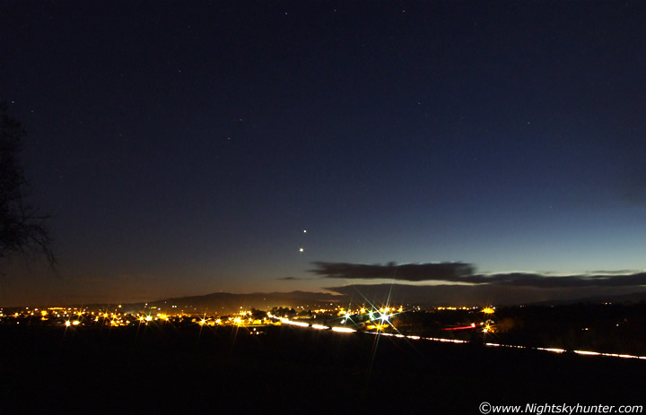 17.04 UT. The view of this conjunction was absolutely beautiful. Seeing the two brightest planets in the sky and a crescent Moon at the same time with such clarity was a real treat. Even if I was clouded out on the following day I would have been happy enough just to see this. The foreground lights belong to homes along Crewe Road. The car trails to the R are on the Coleraine Road. The town of Maghera is marked by the distant lights. It's quite an interesting area where I live. There are mountains in the NW, W, SW, and S, however the eastern side is more or less flat ground. Those mountains tend to lift the air mass approaching from that direction which often leads to some interesting weather phenomena.